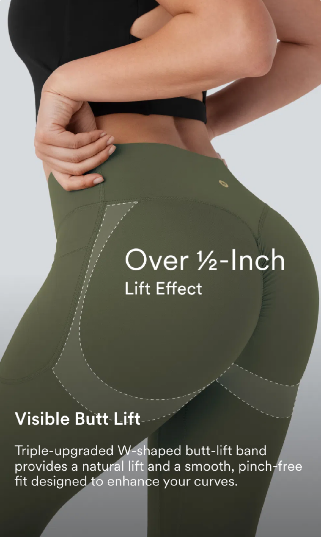Our leggings use a scrunch-lift back seam, 360° sculpting fabric, and a high-compression waistband. Together they lift, shape, and pull in the waist so your butt looks rounder and more lifted instantly.